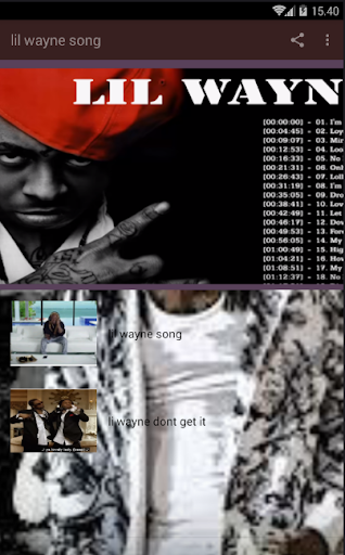 The Biggest Collection of Lil Wayne presents SONG LIL WAYNE SONG streaming application. Listen & enjoy songs Lil Wayne songs in the album You can choose to stream on your gadget anytime anywhere, no big storage needed. This application is streaming without download to preserve the copyright of each song .. As easy as playing your ordinary music player.