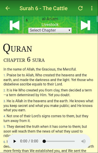Audio recitation of each chapter and verse to facilitate the Muslims around the world.