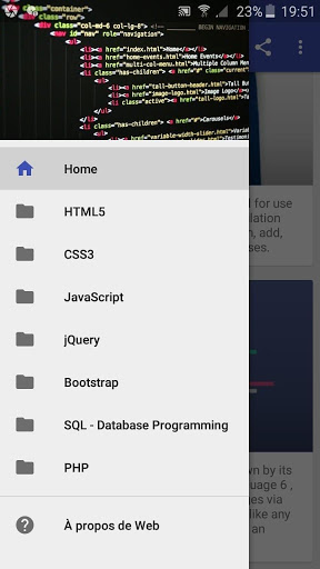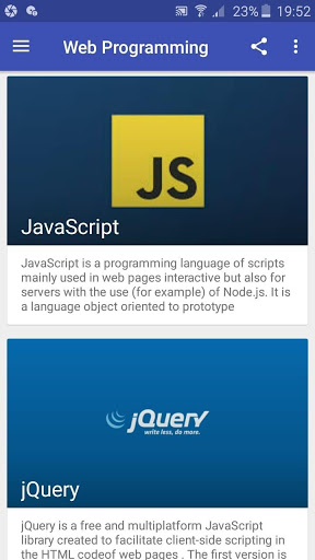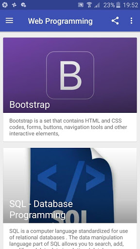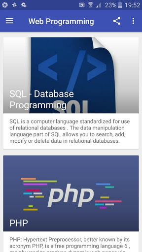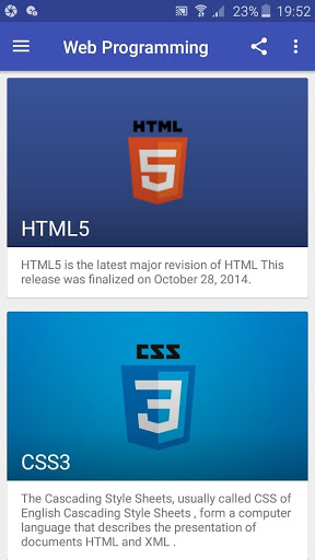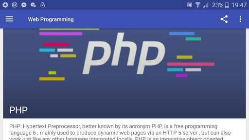 Web Programming language is a Free app which teach you how to design and develop a web site and web application using PHP, MYSQL, CSS, CSS3, HTML5, JAVASCRIPT, JQeury, Bootstrap, All the lessons and topics are featured in a simple