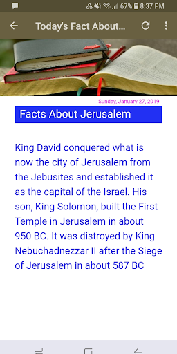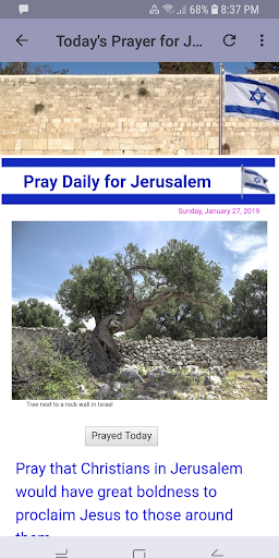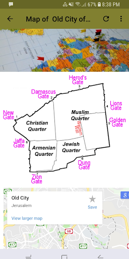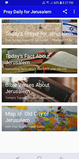 Christian app with daily prayer suggestions, daily facts about Jerusalem, Bible verses that relate to Jerusalem, a map of the Old City of Jerusalem including it's gates