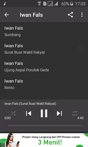 Pemutar musik lagu Iwan Fals ringan, sederhana, mudah digunakan dengan aplikasi ini anda bisa menikmati koleksi lagu Iwan Fals tanpa menggunakan kouta internet