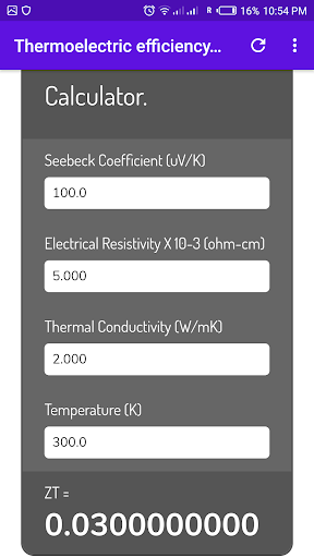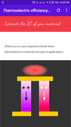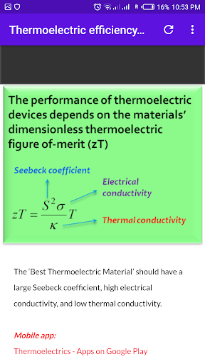 This app has an online calculator for the estimation of the thermoelectric figure of merit (efficiency) of materials. basic information on thermoelectric materials.