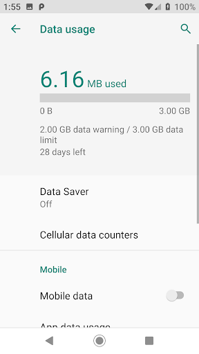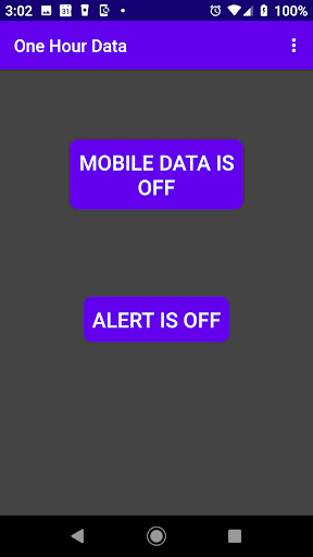 Press the "Set Mobile Data " button and you are taken to the Android settings screen where you may turn ON mobile data (or turn OFF mobile data for that matter). Now in one hour you'll be taken to the mobile data settings page and receive an audible warning to look at mobile data settings.