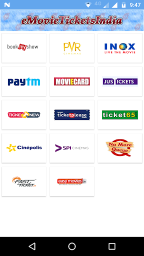 E - Movie Tickets is very useful app for booking movie/cinema tickets online. It has most Indian popular online movie ticket booking portals like BookmyShow,