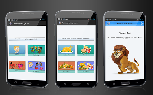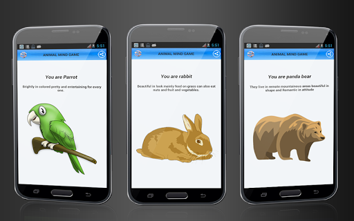 Question related to daily life activity and their common choices, at the end it will show if you're not human then what animal you will be. There is a stream of questions from which a user can choose step by step and at the end a result will be shown in the form of picture. The final result will have description of that animal from which your choice match. You can also share your result with your friends through Bluetooth, face book, twitter, Skype, Gmail, and all other social media option that you have in your device.