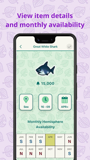 This app allows you to view a list of all collectables fish, bugs, and fossils. For each collectable you can see details about location, time availability, and pricing. We even list which months fish are available in the northern or southern hemisphere.