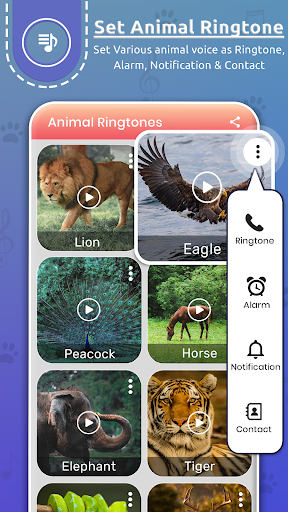 - Set animal sound as ringtone, notification, alarm and assign to contacts