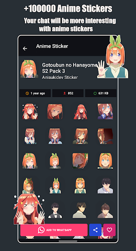Anime Stickers for WA Allows you to avoid boring WhatsApp exchanges with your Otaku musketeers and carry you the stylish way to partake your pets anime stickers packs and different way to prompt your passions via the stylish Anime stickers through WhatsApp. Now you can surprise your otaku musketeers With a large collection Anime Sticker similar as Anime Meme stickers, Animated Anime pack stickers, Anime boys Characters, Anime girls characters stickers, Anime Face response stickers It comes with a dozen hd cute anime stickers for you to choose from, grounded on your mood, with whom you're with and what manga or anime you are watching now.