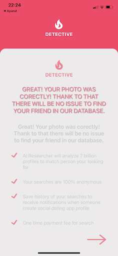 Social dating detective is an entertaining application that allows the user to find out if an acquaintance, best friend, or perhaps a loved one has ever created an account on a dating app or uses it all the time. Remember to upload a clearly depicting photo of the person you are looking for - preferably a selfie photo. Our application will analyze her internal database within seconds and provide you with the result of the search conducted. Find out what others don't know!