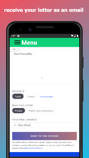 Getting a surprise letter from the past is actually an amazing experience - And we are very good at delivering letters from the past - So send your future self some words of inspiration or comfort. Or make a prediction about your life, your family, or the world. What will the future look like in a year, three years, or more?
