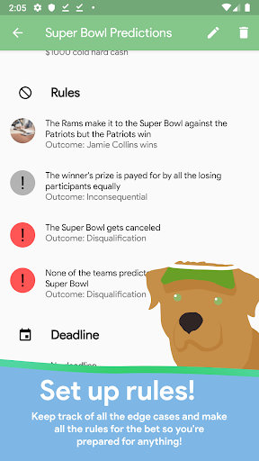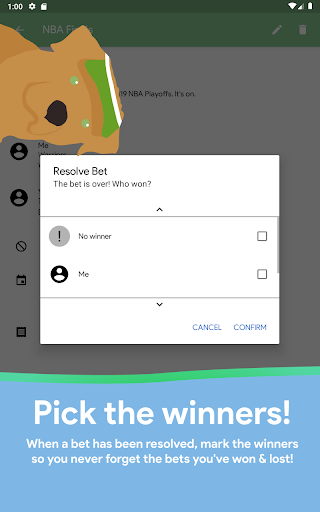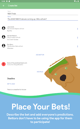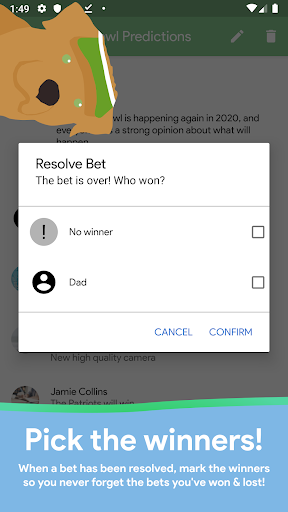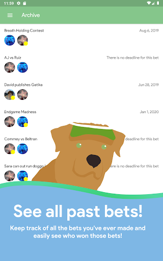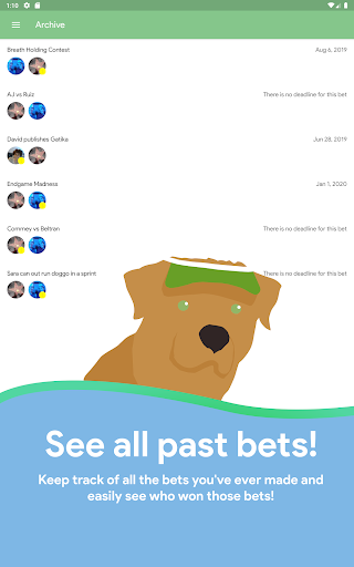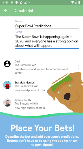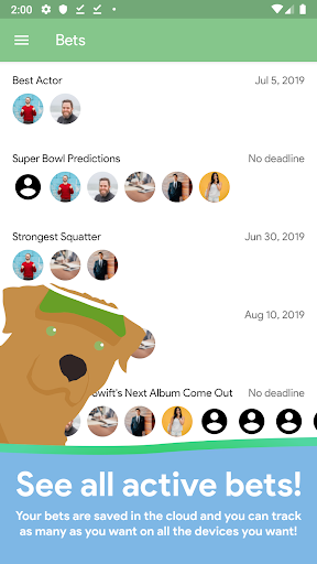 Add your friends to the bet and they'll be able to see all the bets that they are a part of. Bets are saved in the cloud, so don't sweat it if you get a new phone! All your bets will still be waiting for you.