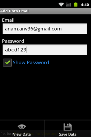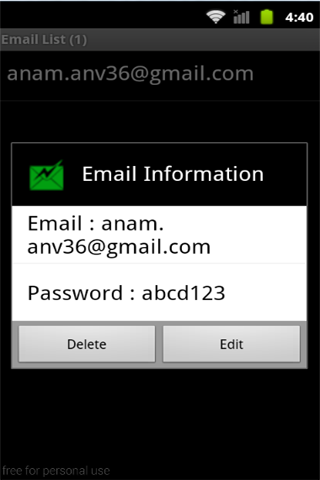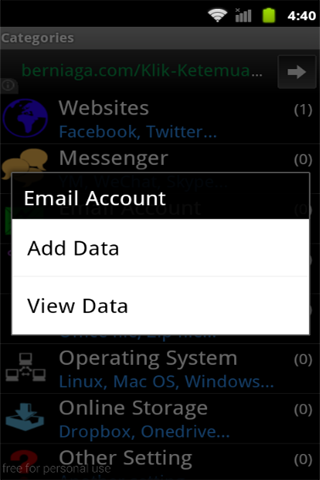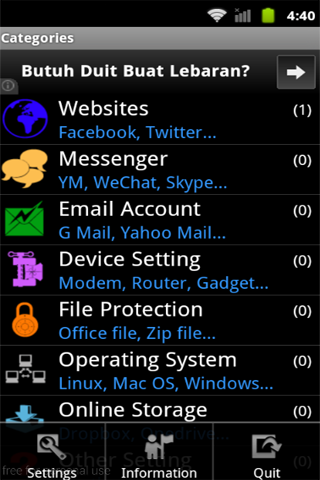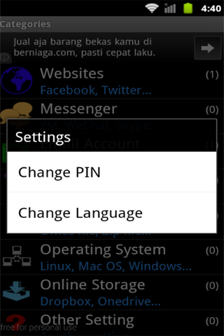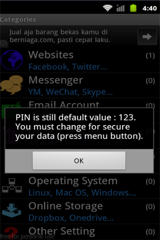 This **FREE** application is very useful for those of you who have a lot of passwords for log in to websites, social networking, email, device settings, file protection, messenger and others. Especially if you OFTEN FORGET THAT PASSWORD. For use this application it's so simple. FIRST TIME, the default PIN is 123 at log in, and then fill out the form at the categories (websites, messenger, email, etc.). Then save data. YOU MUST CHANGE DEFAULT PIN (in categories form press menu button) FOR SECURE YOUR DATA, THEN REMEMBER