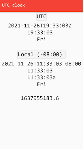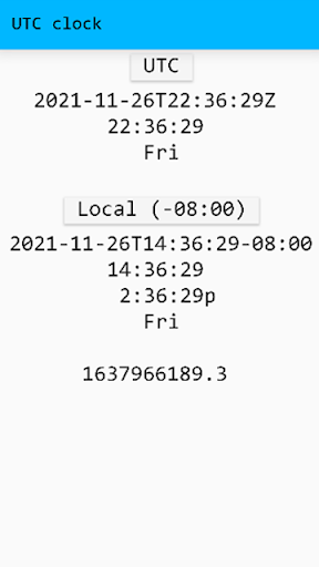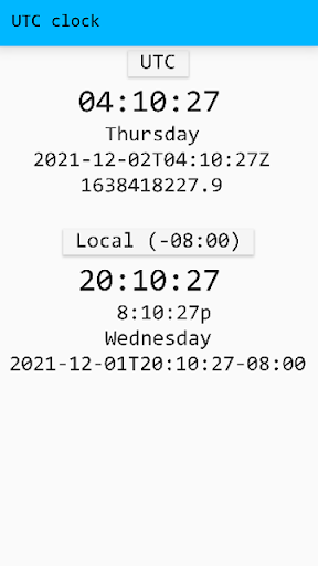 Displays the current device time, in UTC and local formats.