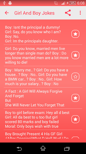 In this free application you're ensured to discover a clever joke to an instant message. In any event twice as fun, children. This is best jokes free applications on the Android market. Download now this Girl And Boy jokes and make happy own self. Girl And Boy jokes application is a nice way to enjoy yourself and friends too.