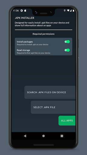- Install .apk files in one click - app will automatically search all files with .apk extension on your phone.