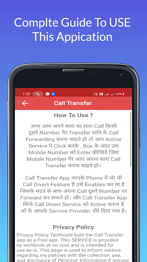 Call Transfer App आपके Phone में जो भी Call Divert Feature है उसे Enables कर ता है जिसके मदत से आप अपना Call दूसरे Number पर Forward कर सकते हो। और Call Transfer App सिर्फ Call Divert Service को Active करता है जो के आपके Service Provider धीरे दिया गया है।