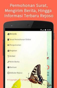 - Surat Permohonan Online, Sekarang masyarakat desa Rejoso bisa mengajukan surat permohonan secara online. Silahkan mengisi form surat yang dibutuhkan. Jika surat telah selesai dibuat, Kami akan menginformasikan ke email / SMS selanjutnya bisa di ambil di Kantor Kepala Desa Rejoso.