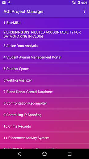 Project Manager is an android application which allows users to refer to the projects which are created by the students in our college. This project aims to update the students about the information, platform, and the various types of tools used to create the projects. Whenever a new project is deployed, our application immediately updates the details of that project .The users are alerted when a new entry is made through notifications.
