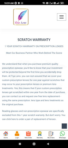 We understand that when you purchase premium quality prescription eyewear, you’d like to know that your investment will be protected beyond the first time you accidentally drop them. At Tiya Lens. you can rest assured that we cover your custom prescription lenses for one year against scratches that may occur to your prescription lenses or premium lens treatments. Yes, this means that if your custom prescription lenses get scratched within one year from the date of purchase, you can contact us and request one free lens replacement - using the same prescription. lens type and lens treatments as the original purchase.