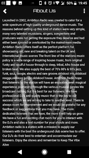 Launched in 2002, Ambition Radio was created to cater for a wide spectrum of high quality underground dance music. The reasons behind setting up this kind of station were very simple, many very talented musicians, singers, songwriters and producers were not getting the exposure they deserve and had either been ignored or overlooked by the mainstream media. Ambition Radio offers itself as the perfect platform for showcasing old, new and breaking talent on the UK and international music scenes The front line of the stations music policy is a wide range of inspiring house music, from original funky and soulful house through to deep, tribal, Afro house and broken beat. We also supply the best of 70’s 80’s & 90’s jazz, funk, soul, boogie, electro and rare groove.oldskool rnb.oldskool reagge,oldskool jungle,oldskool house. Ambition Radio hope that listeners to the station will have an enjoyable, even magical experience, journeying through the various musical genres We broadcast nothing but the best for our listeners. We have professional DJ’s and quality music that is the key to our success which we are aiming to take to another level. There is always room for improvement and we would be grateful for any feedback or suggestions that you may have. The more dedicated listeners that we have, the more it will help us grow. We have a fun and exciting chat room for you to interact with the DJ’s and also a text number for your shouts and more. Ambition radio is a station with a mission to supply our listeners with the best the underground club scene has to offer. Our DJ’s do their best to entertain and accommodate our listeners. Enjoy the shows and remember to Keep The Vibe Alive