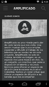 Amplificado es una mirada particular de cada banda que nos visita. Una sesión musical que busca ampliar, expander y difundir el trabajo de los talentos que se involucran en este proyecto. Amplificado no solo es música, también es imágen, es un espacio vivo para música en vivo. Es un conjunto, un colectivo, que pone a disposición el talento y recursos técnicos para ofrecer un espacio de difusión para la escena musical en Colombia. Somos un canal virtual que ofrece un espacio de difusión a las bandas que nos acompañan.