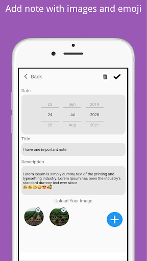 it is simple app which allow you to write daily thoughts/ideas/memories with a simple user interface. Add a visual touch to your memories attaching a photo and emoji.