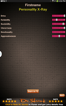 Tell Dr. Shrink your name and age, answer a few questions and presto, be amazed with the accuracy of his analysis. Share your results via Facebook, Email, or SMS - it's as easy as pie.