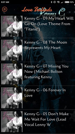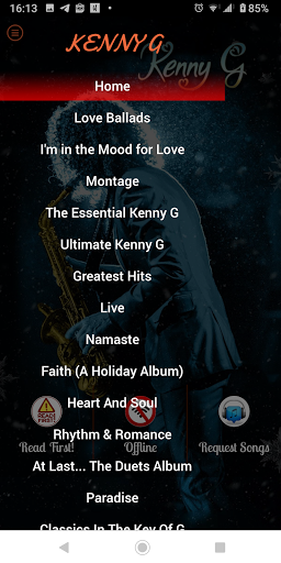 This application contains a collection of instrumental songs by Maestro Jazz Saxophonist from the United States Kenny G, Kenny G being one of the best selling album artists of all time with his album entitled "Duo Tones" with his flagship song "Song Bird", and "Don ' t Make Me Wait for Love "made himself a worldwide saxophonist, not only the albums and songs that have been mentioned above but this application also contains a collection of other Kenny G albums such as" Paradise "," The Moment "," Breathless "," Live "," Silhouette "," Heart and Soul "," Faith "," Rhytm & Romance "," G Force "," Namaste "," Love Ballads "," Classics in the key of G "," At Last ... ", I'm in the Mood for Love".