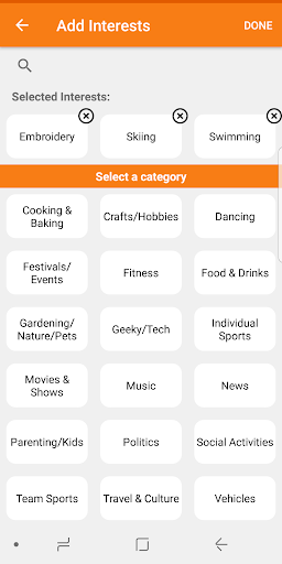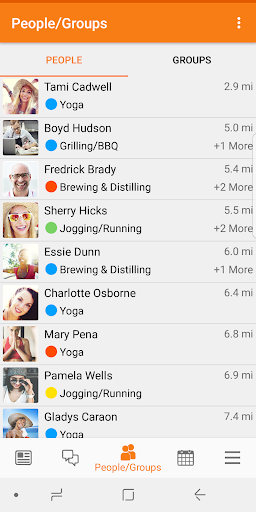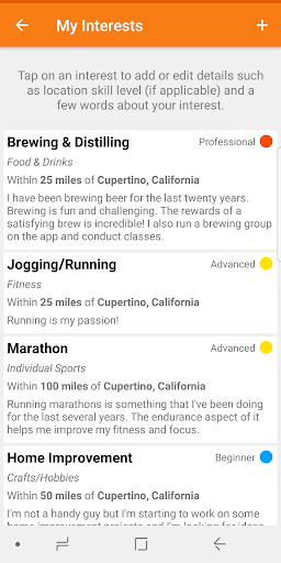 Automatically connect with people / groups with common interests. Set a location and distance radius, skill level for each interest to limit your search.