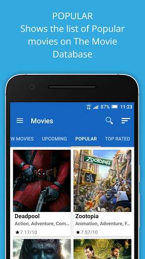 - POPULAR tab - Shows the list of the most popular movies at this time. List is shown by Movie Database.