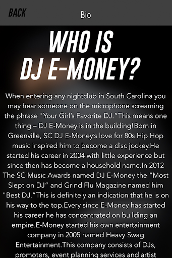 Dj E-Money is Carolina's #1 Dj that caters to the ladies. He can be heard in the clubs and private events. He also serves
