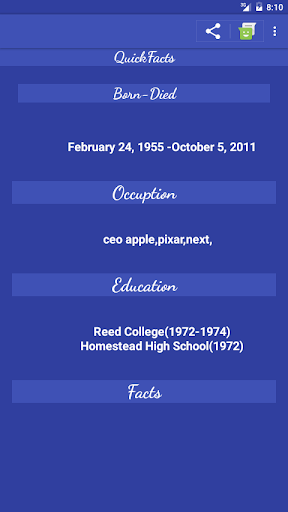 it includes the quotes ,their facts and briefs information of those famous people in history of this world,right now its provide you only 12 famous persons ,in future release the app will provide you all others personalities also ,