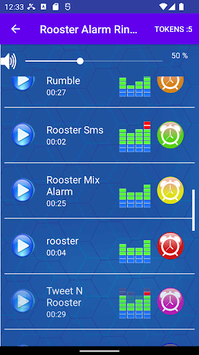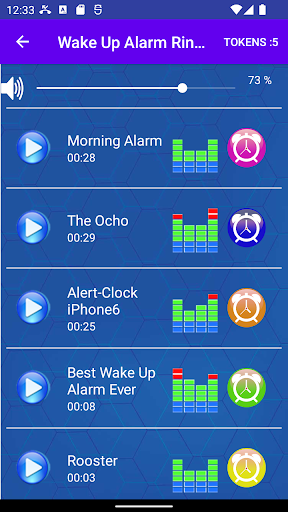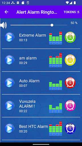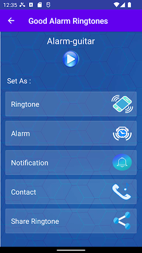 Open Alarm Clock Ringtone app, you can press the " play " button to listen to the MP3 music tones.