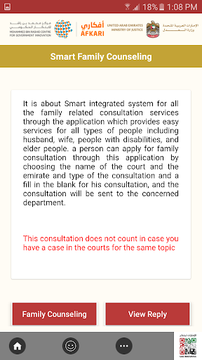 It is about Smart integrated system for all the family related consultation services through the application which provides easy services for all types of people including husband, wife, people with disabilities, and elder people. a person can apply for family consultation through this application by choosing the name of the court and the emirate and type of the consultation and a fill in the blank for his consultation, and the consultation will be sent to the concerned department.
