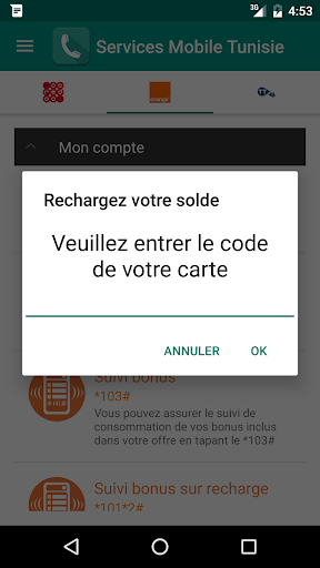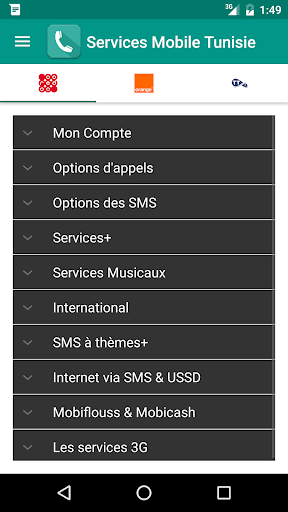 C'est pourquoi ,pour vous faciliter le quotidien, nous avons conçu pour vous l'application utile Services Mobile Tunisie ; C'est une application ergonomique et facile d'utilisation , elle contient une liste ,mise à jour régulièrement, de tous les codes USSD des opérateurs Tunisiens (Orange , Ooredoo et Tunisie Telecom) , tout ça en un seul Clic!