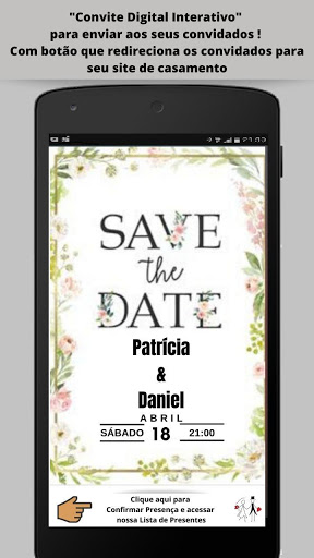 O Save the Date tem opção de um botão clicável, que redireciona os convidados para o seu site de casamento ou para sua Lista de Presentes ou para Confirmarem Presença, o que desejar !