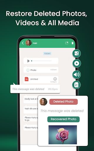 Recover text messages for WA within seconds of deletion and feel no worries about the recently deleted text and media. Whats web for WA allows users to recover deleted messages including voice notes, pictures , documents and other media items.