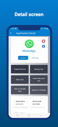 • Shows application information: package name, installation date, build number, version name