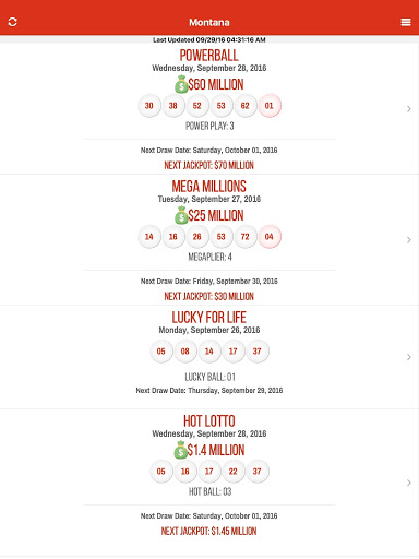 Montana Lotto Results for MT Lottery Games. Easy and Fast Lottery Jackpots, Winning Numbers, Draw History, Payouts and Prize Levels for Powerball, Mega Millions and all other State Lottery Games.