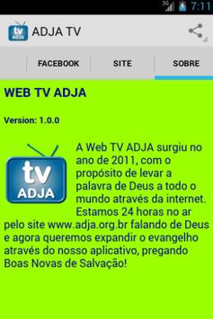 A Web TV ADJA surgiu no ano de 2011, com o propósito de levar a palavra de Deus a todo o mundo através da internet. Estamos 24 horas no ar pelo site www.adja.org.br falando de Deus e agora queremos expandir o evangelho através do nosso aplicativo, pregando Boas Novas de Salvação!