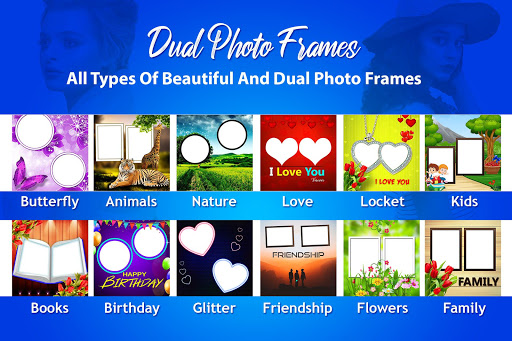 ✔ Photo Frames : 20 frames for each dual photo frames categories like Love, Book, Birthday, Animal, Family, Glitter Photo Frames and many more frames.