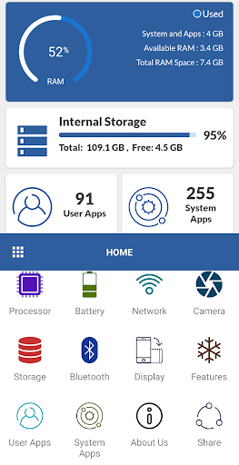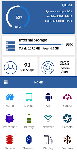 Mobile Device Info is a small powerful app which help you to get the complete details about your android phone. Device Info includes information about CPU, RAM, Operating System, All Sensors, Mobile Storage, Battery Status, SIM Card Details, Bluetooth, Installed Android Application, System Application, Display, Camera ( Front and Rear), Thermal, etc. Check below feature for more details.