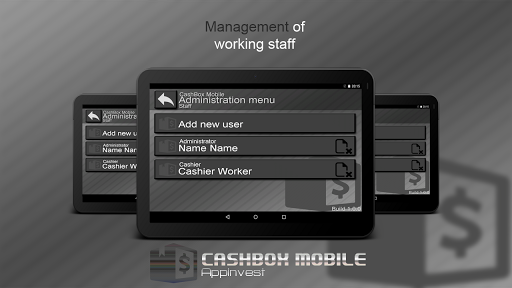 CashBox Mobile - the multifunction application working as the cash register has the convenient and pleasant interface, allows to keep quickly and precisely account of sales of products in groups, the cash accounting and the accounting of a working staff. CashBox Mobile turns any ANDROID device into the multifunction cash register.