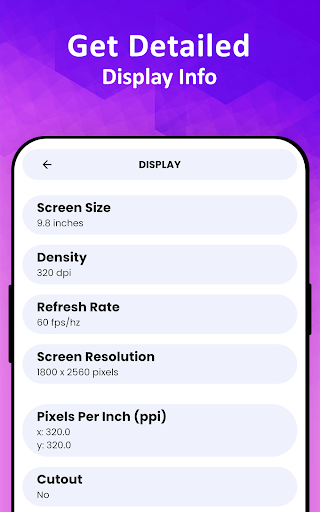 This feature provides Screen Size, Screen Density, Screen Refresh Rate, Frame Per Seconds (fps), Screen Resolution, Pixels per Inch (ppi), Density Independent Pixels (dpi) and etc.