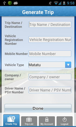 The application is designed to collect data into the following parameters: Date Trip is made, Vehicle Type (Matatu, Bus, Lorry, Private), Vehicle Registration Number, Vehicle Fleet Number, Trip Name (start and destination of the trip), Driver’s Name or PSV Number (if known), Highway used, and Owner/Company Name of the vehicle.