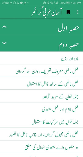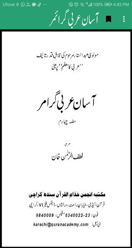 Asan Arabi Grammar is comprising on four parts. All parts have been gathered in one app. Asan Arabi Grammar is written by Lutuf ur Rehman (Markazi Anjuman Khudam ul Quran, Lahore).