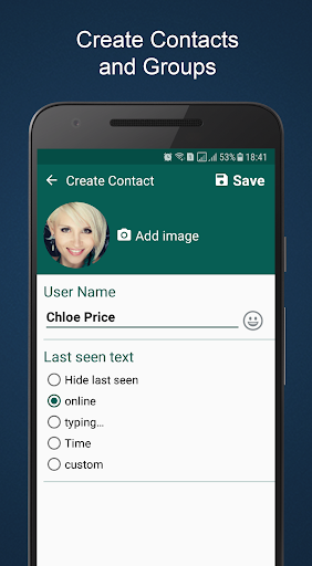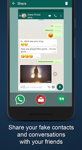 Fake Chat lets you create realistic mocks of chat conversations and share it with your friends. Create Whats Prank contacts and conversation and have fun with your friends and family.