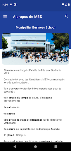 Find all usefull information in one place : • Schedule • Absences • Grades • Moodle • Campus map • MBS Social Networks And more functionalities to come..