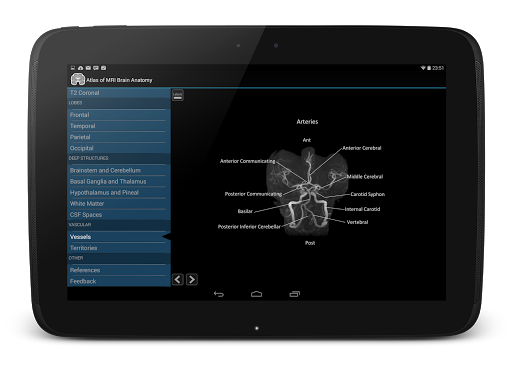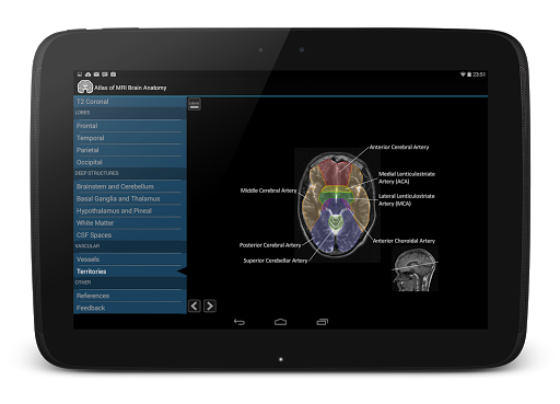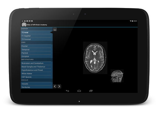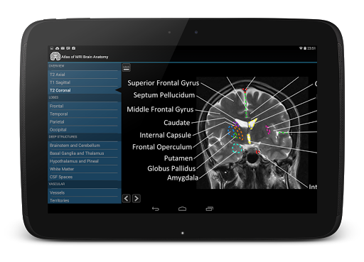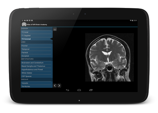 Atlas of MRI brain anatomy is the definitive MRI neuroanatomy guide. It contains zoomable cross sectional MRI brain in three planes, labelled in detail.