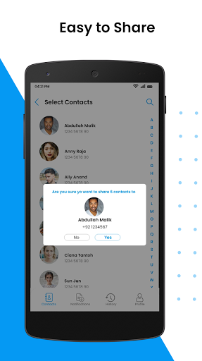 Phone Contacts Sharing Manager is a contacts sharing application designed to assist smartphone users to share contacts quickly and easily. phone contacts sharing application includes a contact list with a simple interface designed with icons and large text to help users can see easily. You just need to choose the person in your contact list and share it.